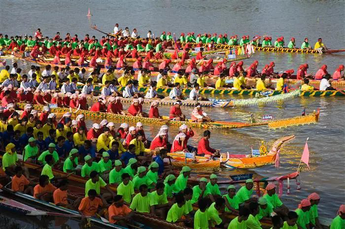 庆祝活动从早上就会开始,民众们会一大早便前往各间具备条件的寺庙祈福祭祀布施,而湄公河畔的龙舟赛事也已准备就绪。数十支队伍将在河中激烈角逐,直至日落夕照才分出胜负。