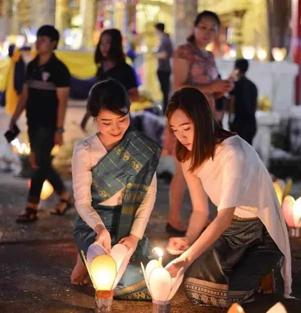 除此之外,还有一项放灯船的宗教活动,是用来纪念“五佛之母”的仪式。水灯节之夜,尤其湄公河边最是热闹,身着老挝传统盛装的青春美少女们画着精致的妆容,捧着亲手精心制作的水灯前来祈愿,希望能早日寻到有缘之人,牵手爱情。所以在这旖旎的夜晚,也不乏是青年男女们结缘约会的好时机。